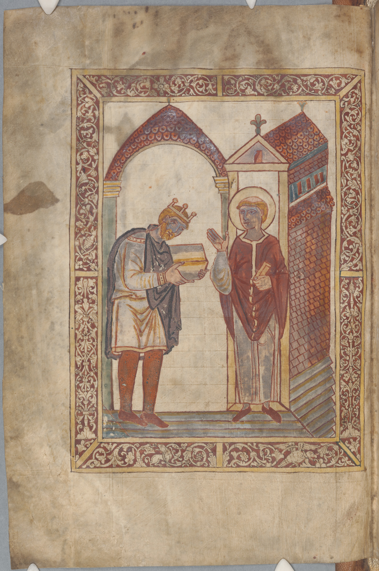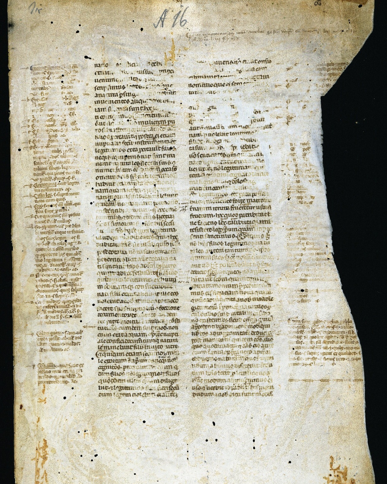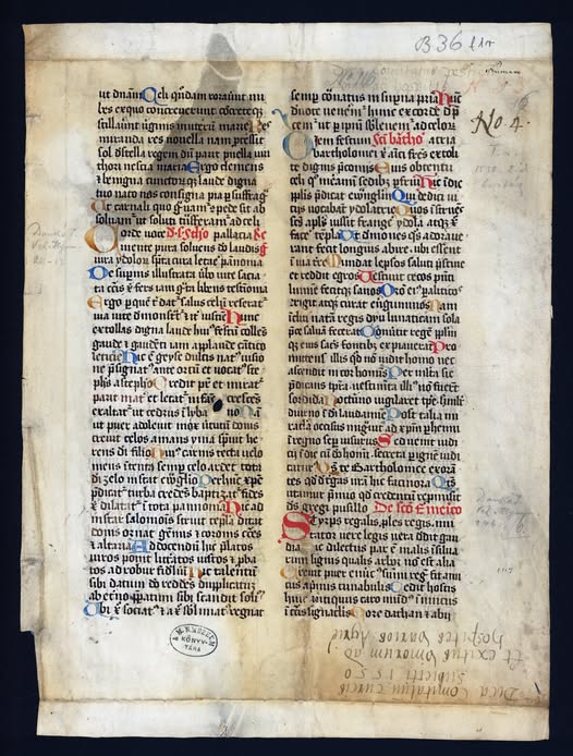 Az egyik egy 13. század végén, Bolognában másolt pergamenkódexből kivágott levél, amelyen Jusztinianosz bizánci császár (527-565) törvényeihez írt magyarázatok olvashatóak.