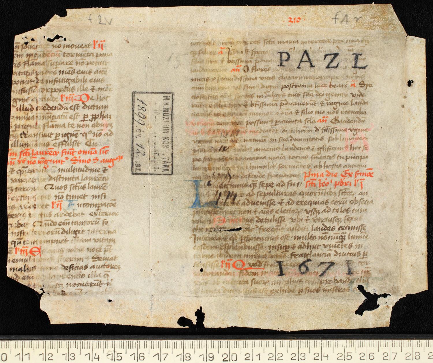 A két könyv a töredéken látható tulajdonosi bejegyzés, superexlibris (PAZL, 1671) alapján a lambachi kolostor egyik 17. századi apátja, Placidus könyvtárához tartozott.
